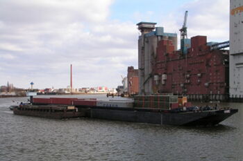 Binnenschiff als attraktives Verkehrsmittel auf der Unterelbe weiter gestärkt. Der Verkehrsträger Straße wird entlastet. Spedition Walter Lauk transportiert Container per Binnenschiff aus dem Hamburger Hafen zum Elbehafen der Brunsbüttel Ports.